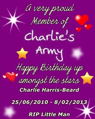 Hayley; I first found out about Charlie when we set up Jacobs Facebook group. I remember searching for Birmingham Children’s Hospital and his page popped up and I have followed him ever since. There was something quite special about this little boy. I loved looking through his gorgeous smiley pictures and his family are quite simply amazing! I got to know Joey through twitter and arranged to meet them all in hospital while Charlie was having his trial drug to drop of some presents for the family . Charlie was gorgeous, and Fiona and Joey were lovely and I was very honoured that they let us visit. Jacob had a wail of a time eating biscuits and being cheeky! It is a time I will never forget as Charlie and his family changed my outlook on life.
