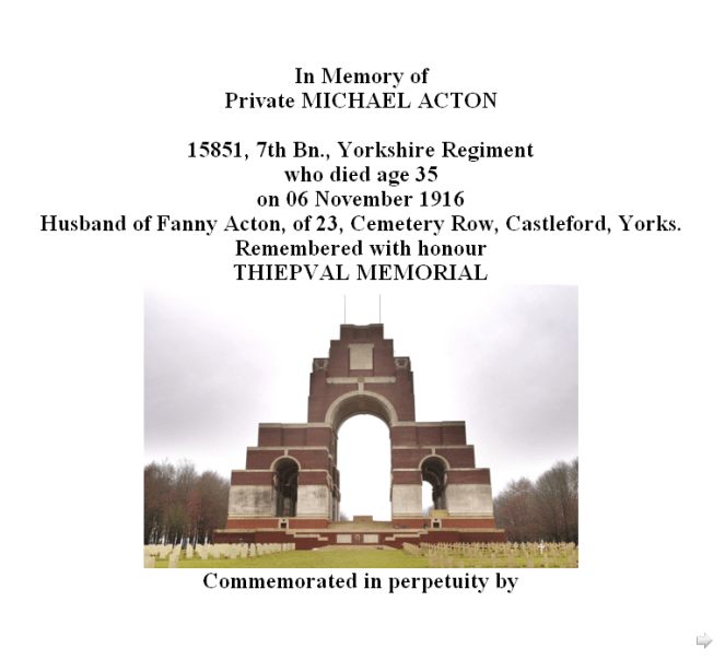 My dad didn’t want me to look into his family tree he thought there was some dark secret. What I founfwas a tragic tale of a man who went to war and never came back leaving a wife and seven children behind. My grandad never knew his father, my dad recalls only ever once seeing a photo of a tall man, that when he asked who it was he was told it was his grandad, a blond haired, haired blue-eyed Irishman, the photo disappeared and was never seen again. I will never know the answer to why a miner who had no need to fight decided to go to the front, one can only speculate that it was for a better life for him and his children, sadly like so many others he never returned home.